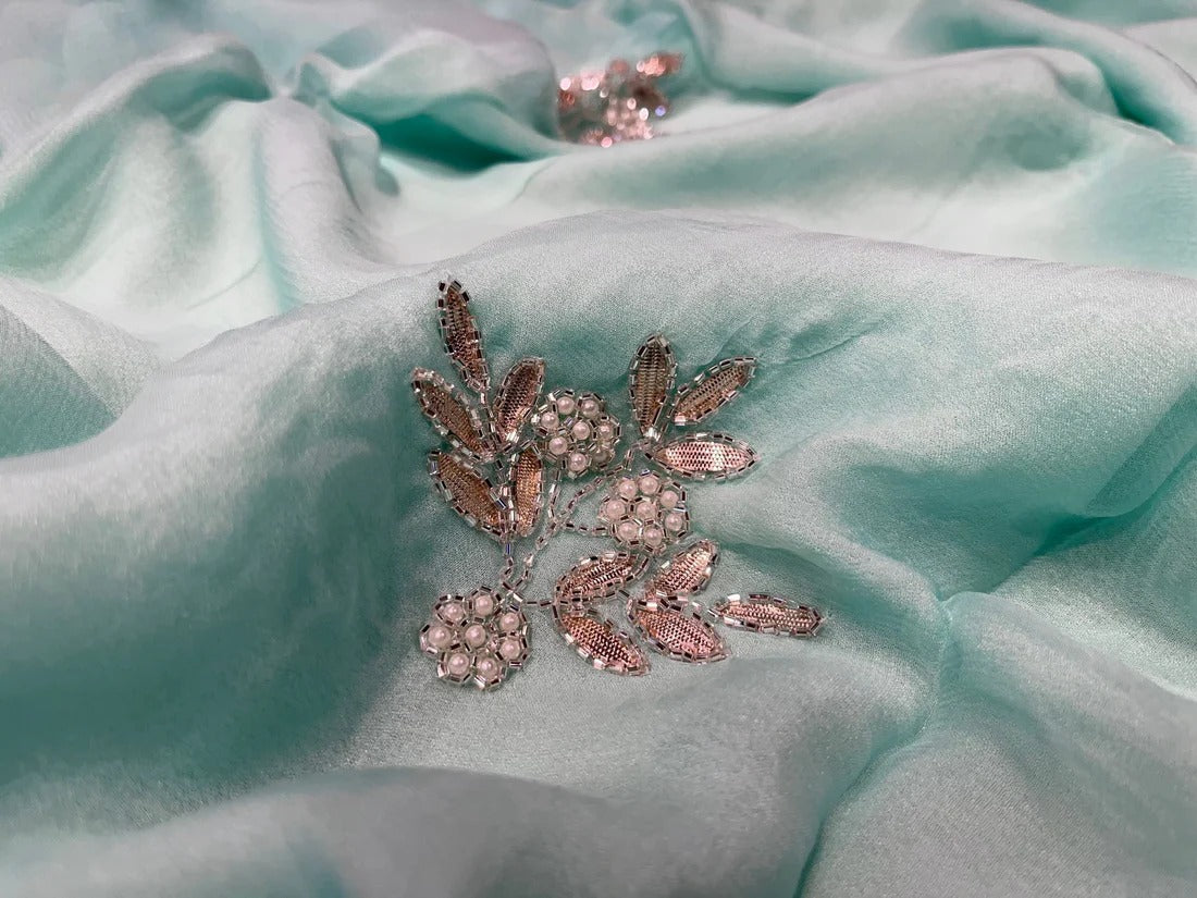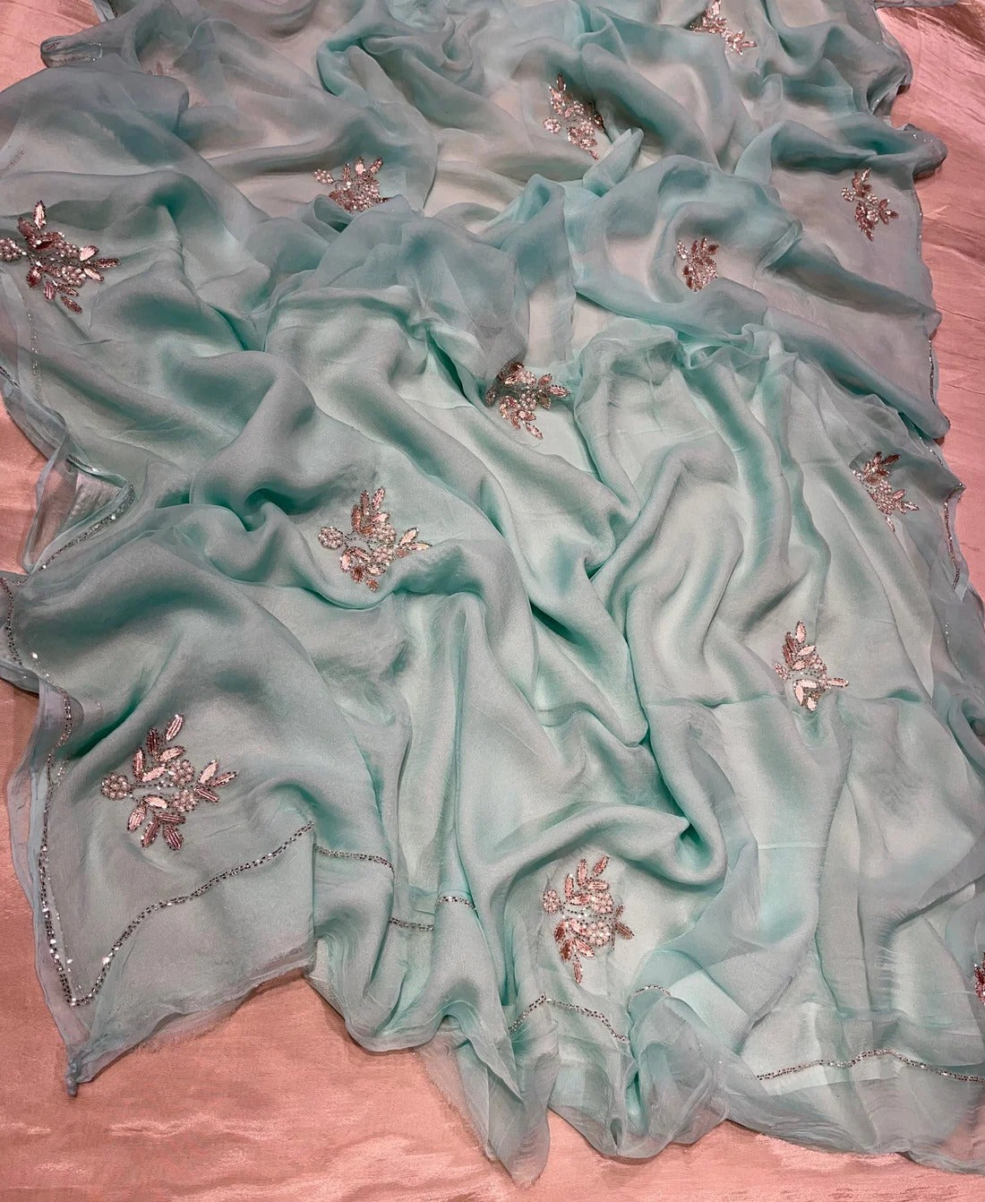 AQUA COLOUR CHIFFON SAREE EMBELLISHED WITH PEARL & GOTA PATTI WORK