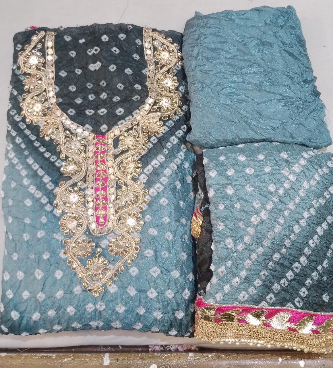 Bandhej Cotton Gota Patti Unsititched Suit. With Kundan Work