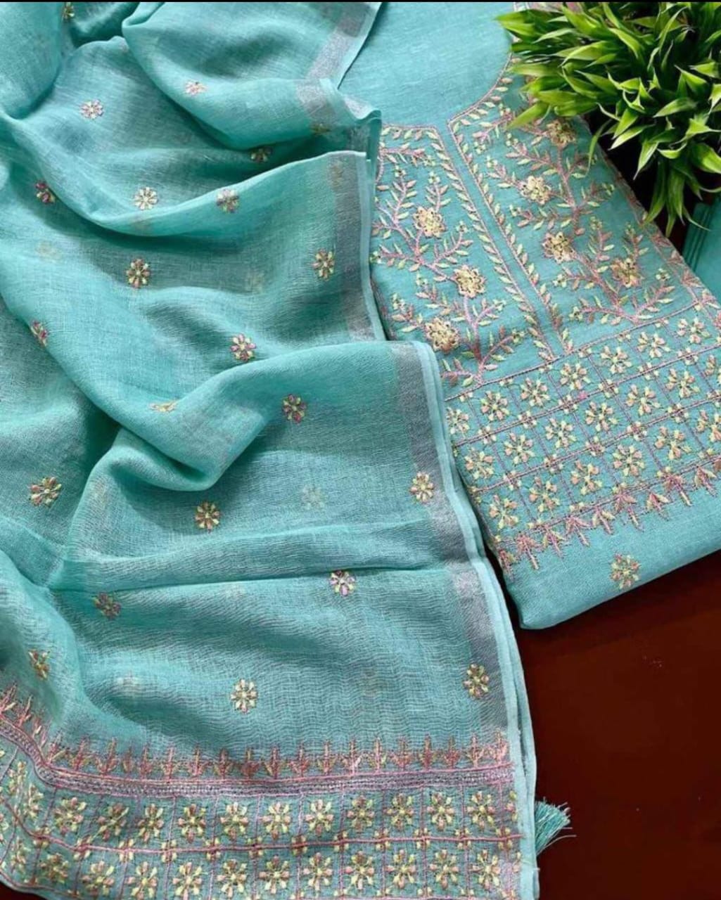 BHAGALPURI COTTON LINEN EMBROIDERY UNSTITCHED SUIT.