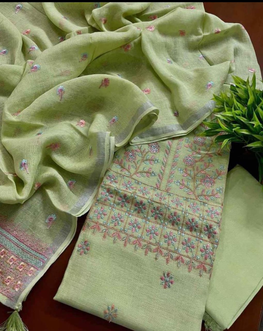 BHAGALPURI COTTON LINEN EMBROIDERY UNSTITCHED SUIT.