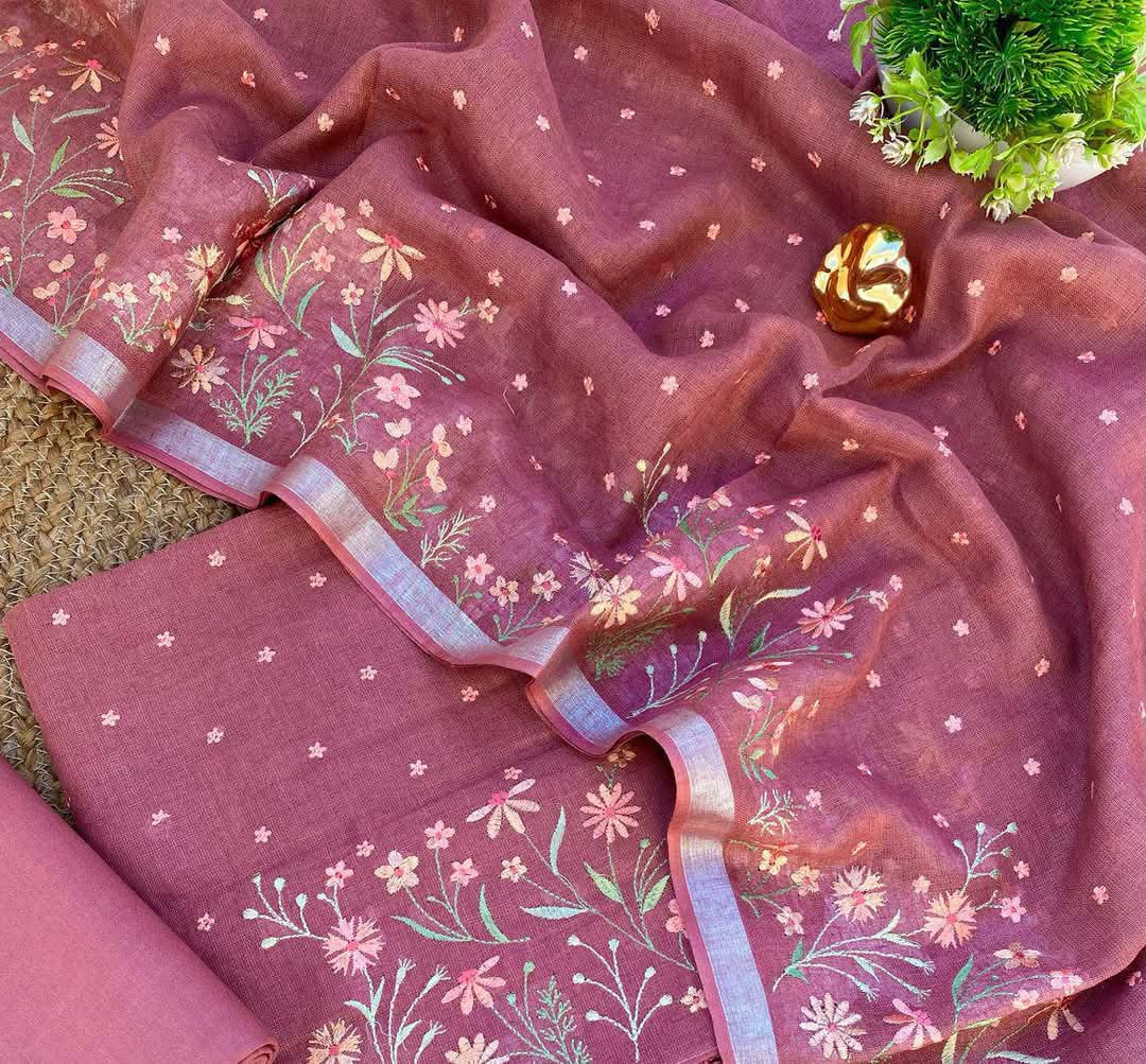 BHAGALPURI COTTON LINEN EMBROIDERY UNSTITCHED SUIT.
