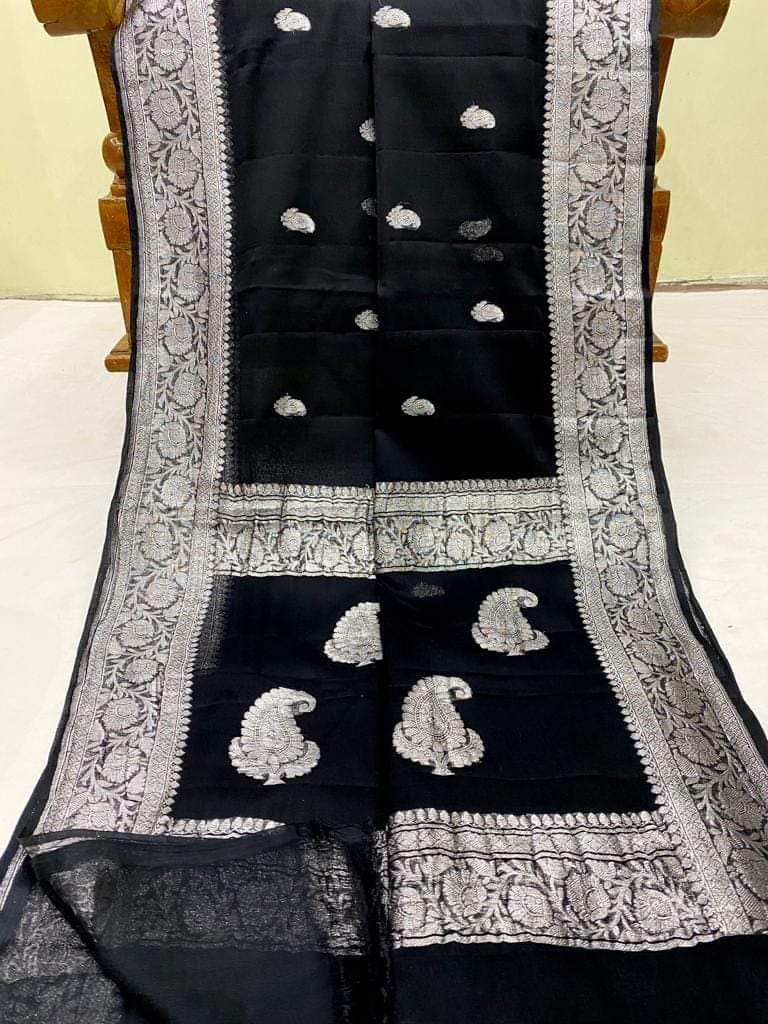 Pure Handloom Khaddi Chiffon Georgette Saree With Silver Zari Weaving Blouse ( length- 6.3 meter )