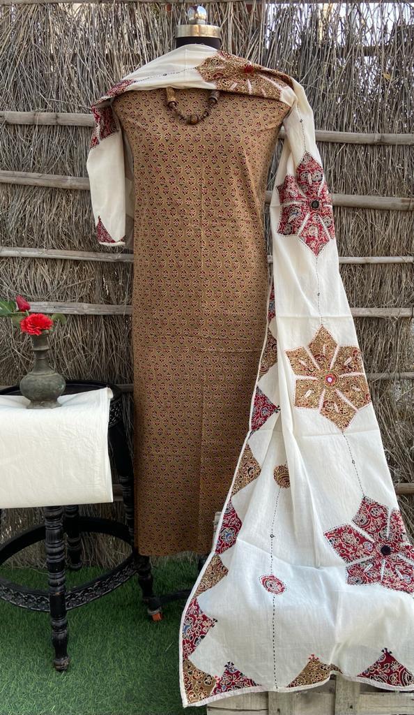 Pure Cotton Ajrakh Printed Unstitched Suits With Patach & Mirror work Dupatta
