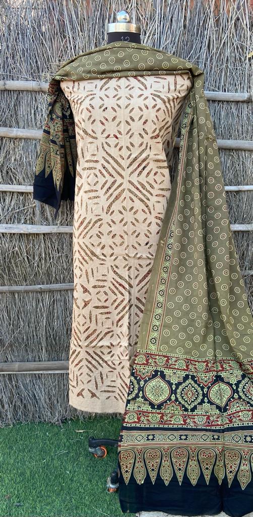 Pure Cotton Azrak Hand Work Unstitched Suits With Azrak Dupatta( Without Bottom)