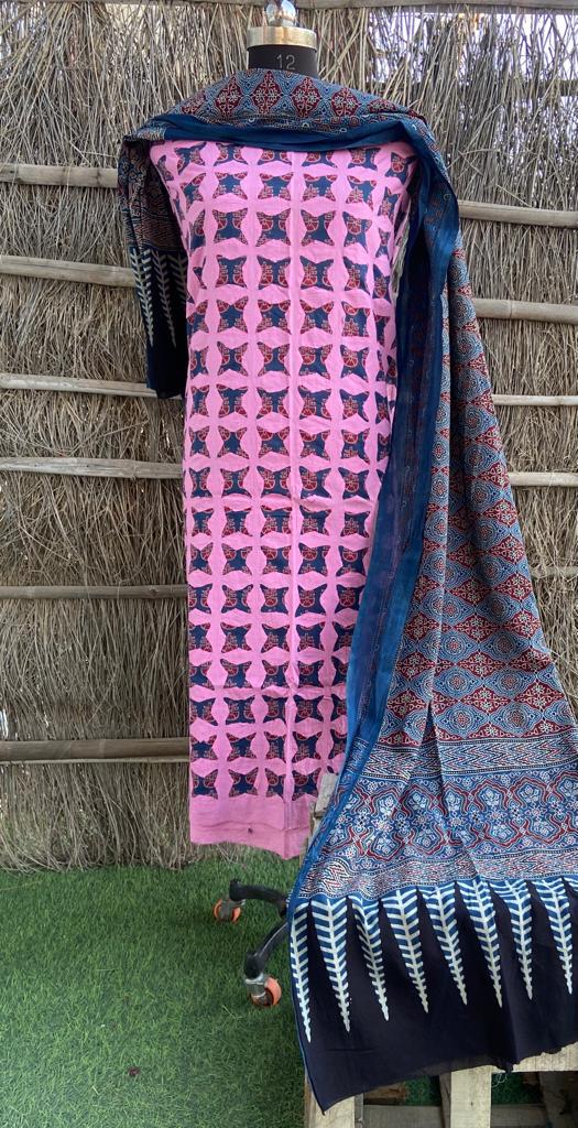 Pure Cotton Azrak Hand Work Unstitched Suits With Azrak Dupatta( Without Bottom)