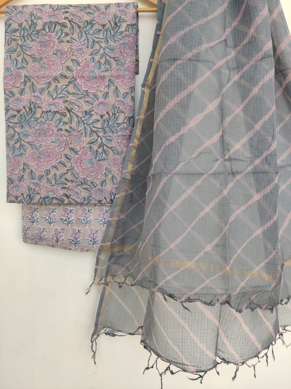Pure Cotton Hand Block Printed Unstitched Suits with Kota doriya Dupatta.