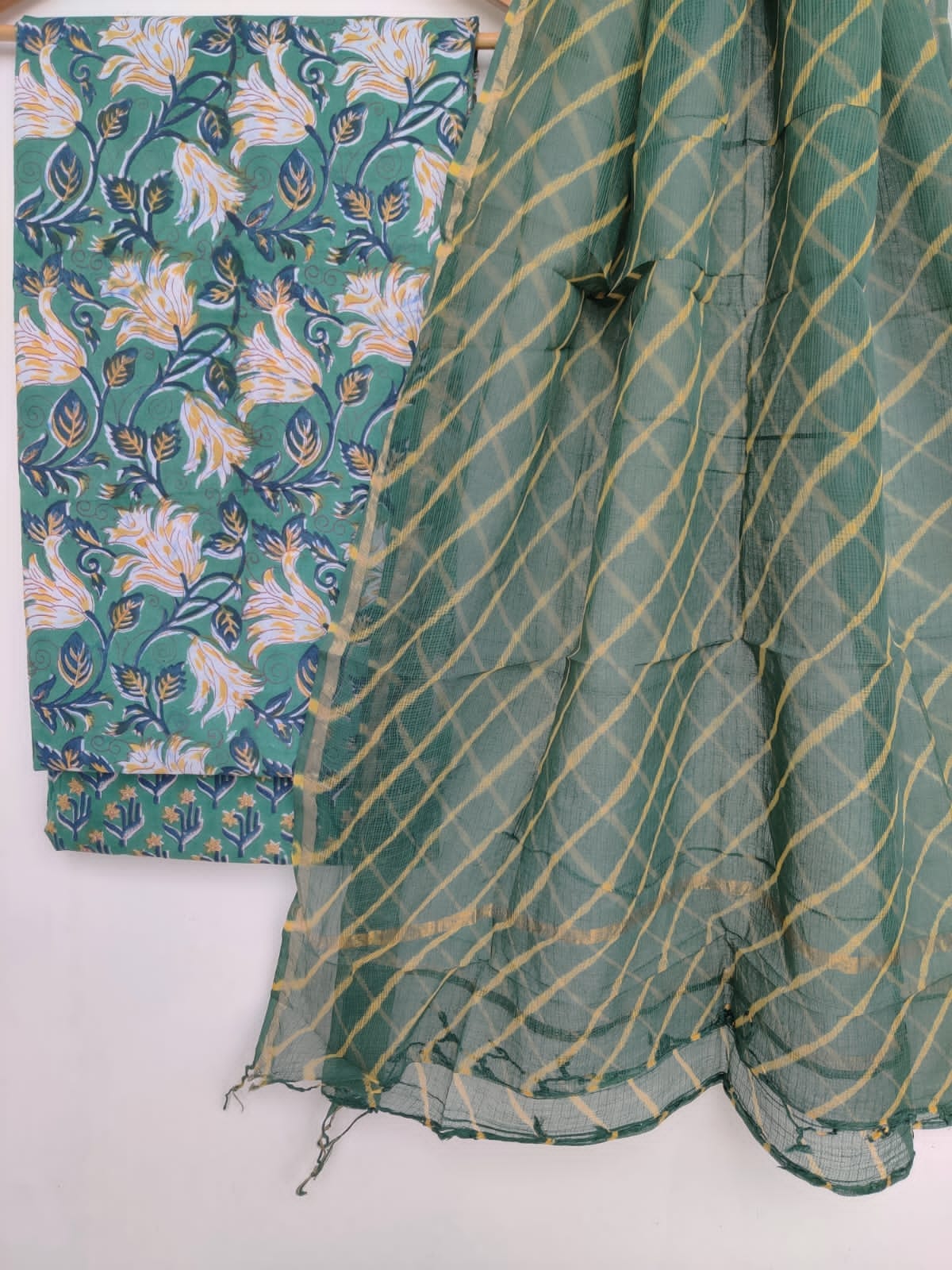 Pure Cotton Hand Block Printed Unstitched Suits with Kota doriya Dupatta.