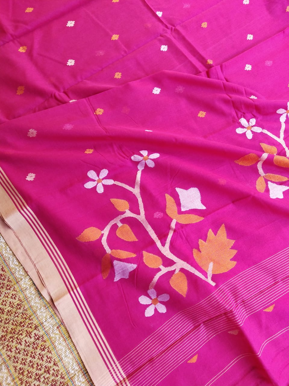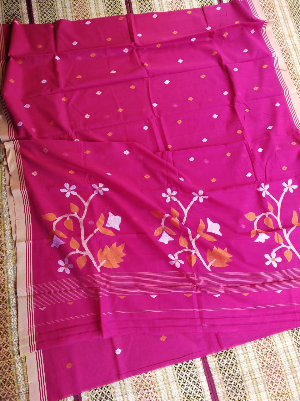Crafted from the finest quality of pure cotton, this Jamdani saree exudes elegance and sophistication. With intricate weaving and delicate patterns, it is perfect for any occasion. Experience the luxurious comfort and effortless style with this timeless piece.