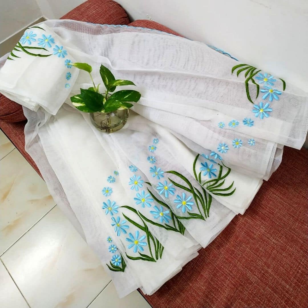 Pure Cotton Kota Doria Saree With Embroidery work and Blouse.