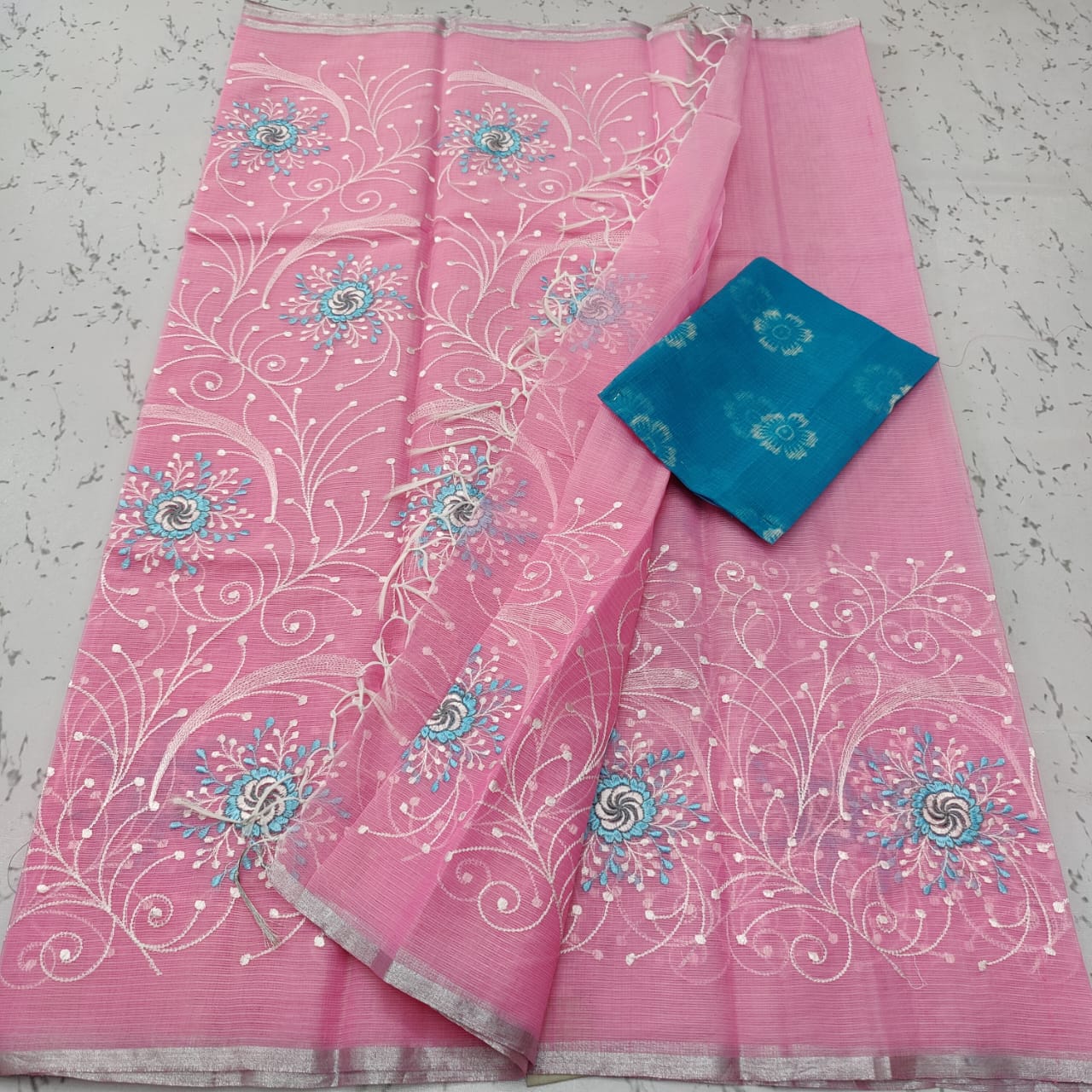 Pure Cotton Kota Doriya Embroidery Saree With Blouse