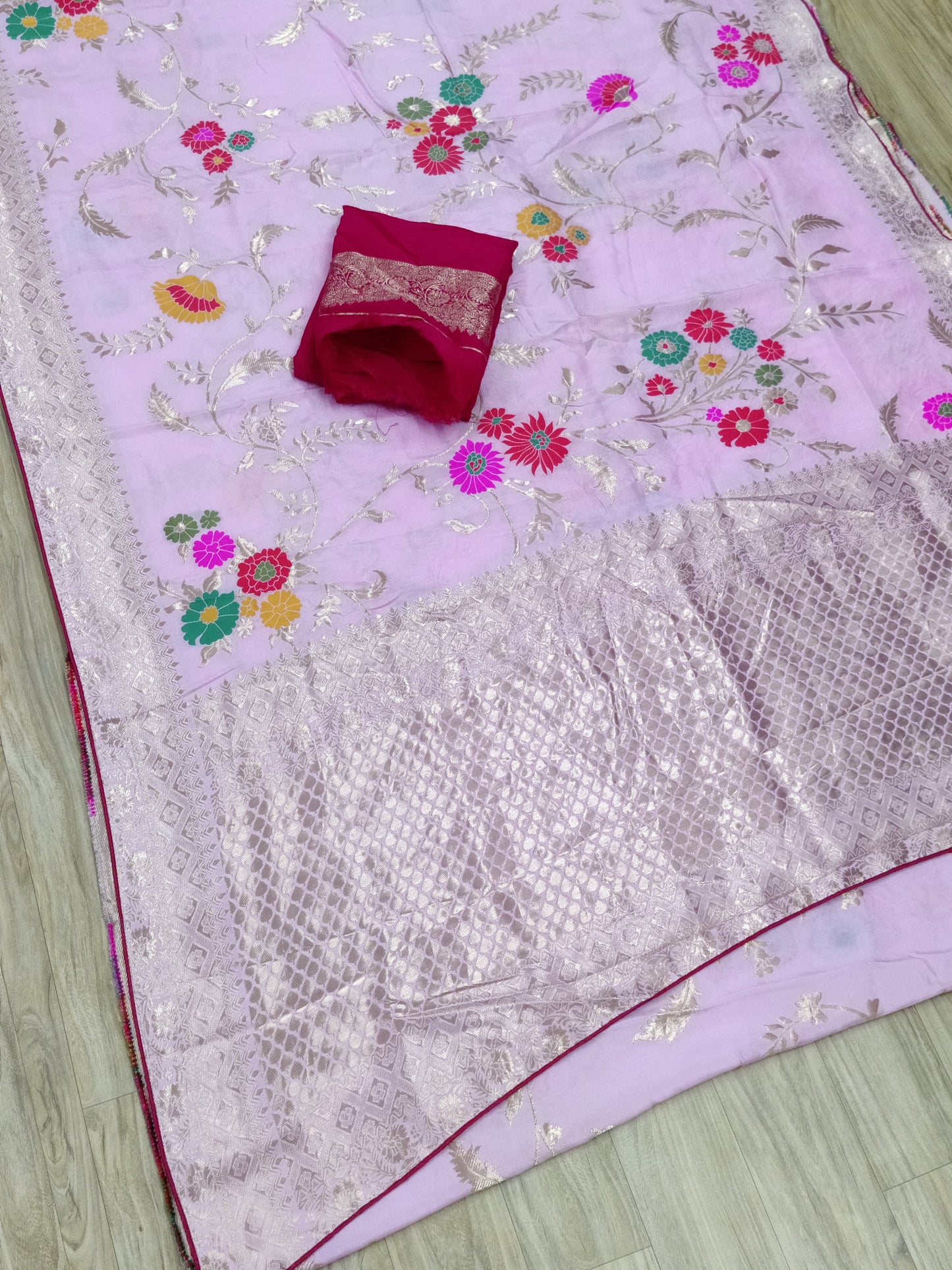 Indulge in elegance with our Pure Munga Silk Beautiful Zari Mina Pattern Work Saree. Made with the finest quality silk and adorned with intricate zari and mina patterns, this saree exudes luxury and sophistication. Elevate your style and make a statement at any special occasion.